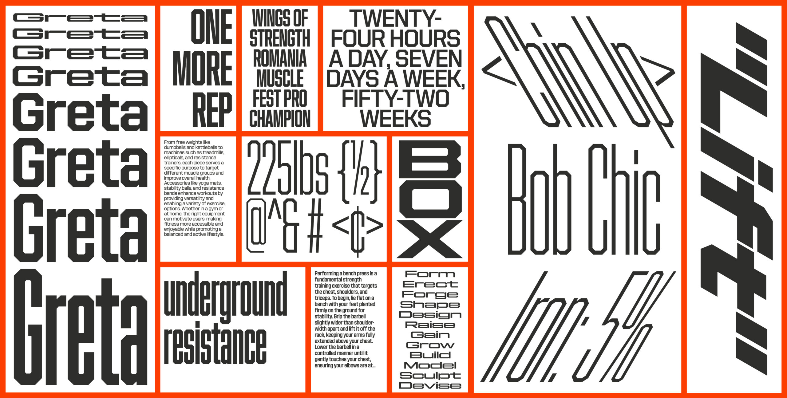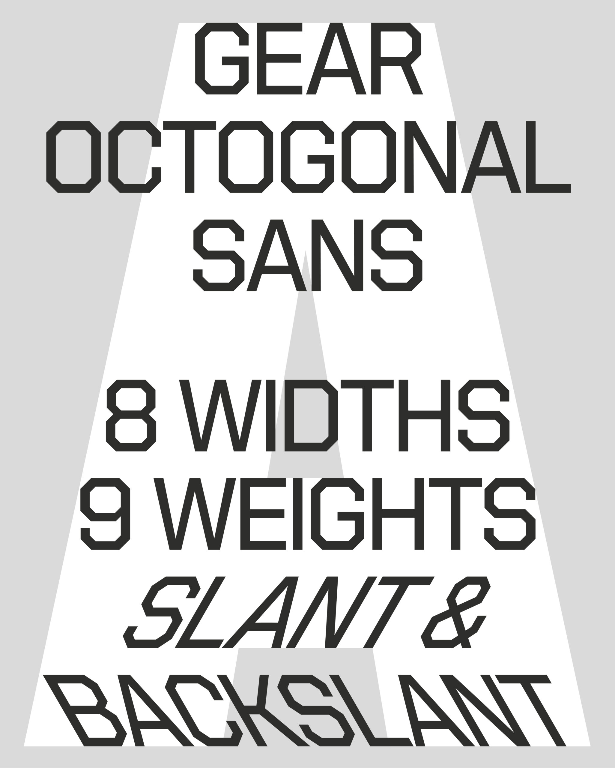 Gear is a flexible octagonal sans serif with an athletic aggression designed by MCKL. The typeface was designed to be flexible and modular. Gear comes in hot and heavy with a wide range of styles from XXXWide to XXNarrow, XXLight to Ultra, Slant, and Back Slant.