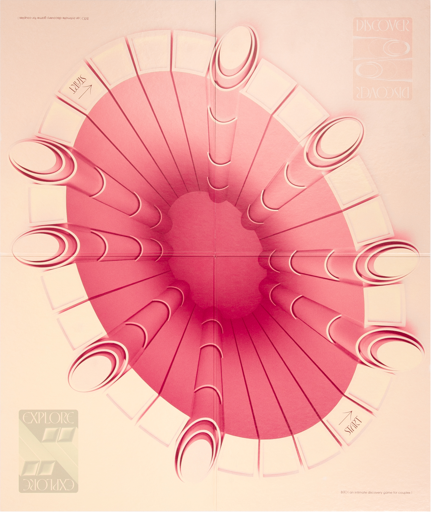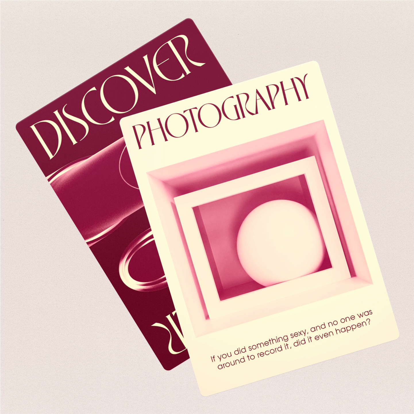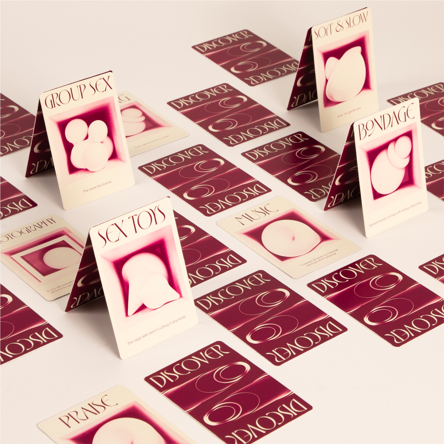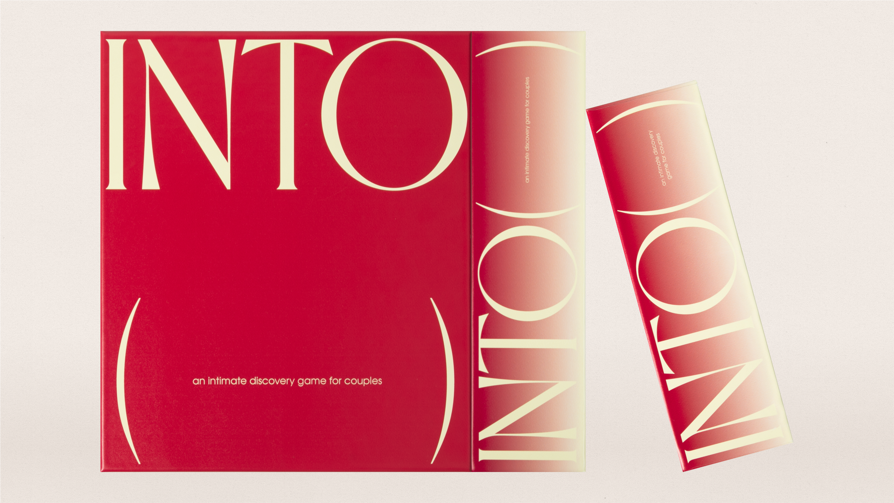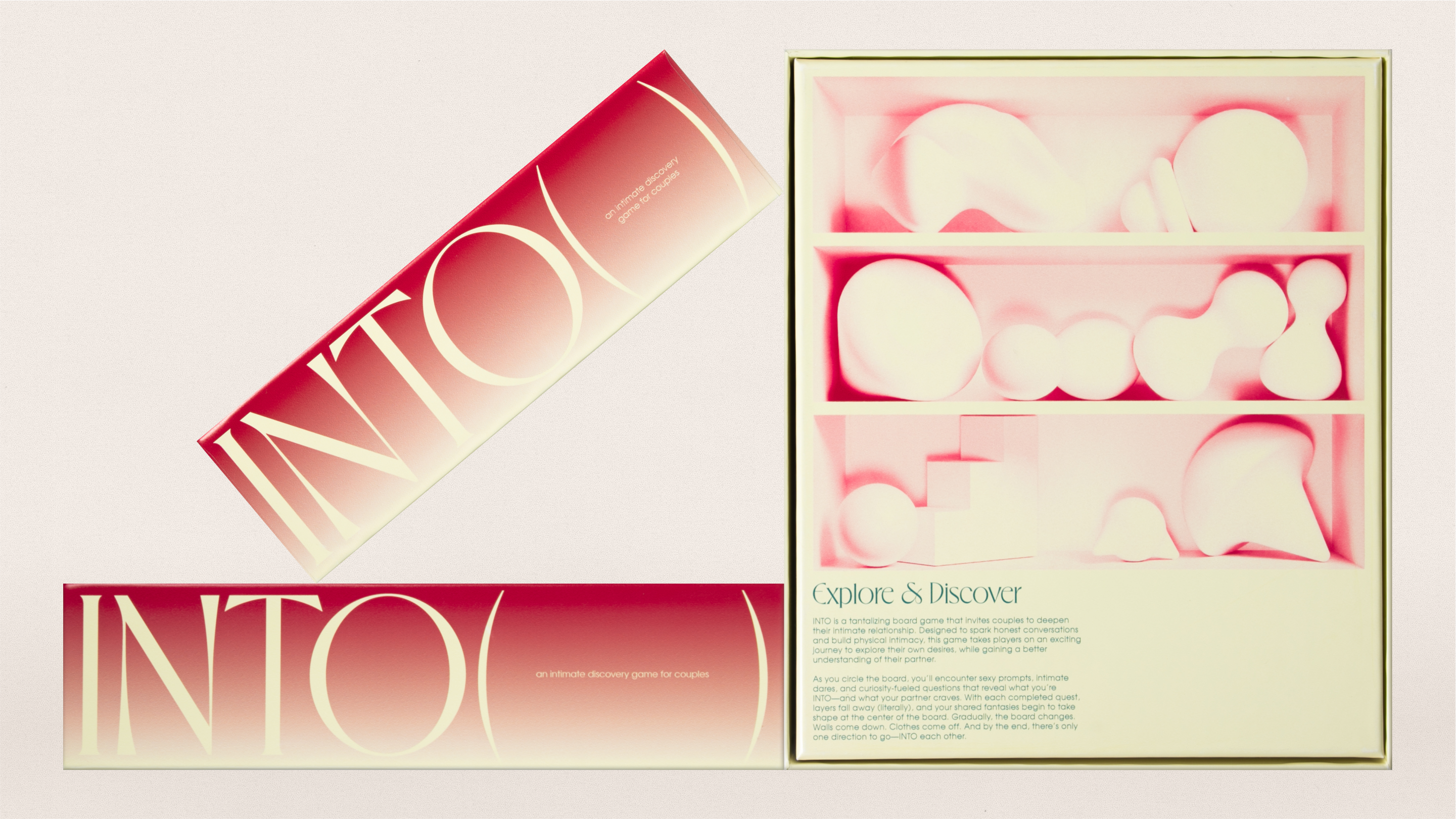INTO is a tabletop game that fosters open communication and intimate relationships. I collaborated directly with Betty Pham to design the game elements. We chose Eros by VJ Type as the main display typeface. The letterforms are inspired by Herb Lubalin’s designs for Eros Magazine. Unlike other raunchy couple’s games, INTO was designed with the intention of being displayed in a living room, bookshelf, or credenza – not hidden, tucked away, out of sight. 3D illustrations were directed to hold metaphors of physical intimacy. Each composition feels like a snapshot, caught in the act. As if you walked into a room and witnessed something maybe you should’ve seen. Perhaps these shapes will learn to lock the door next time.