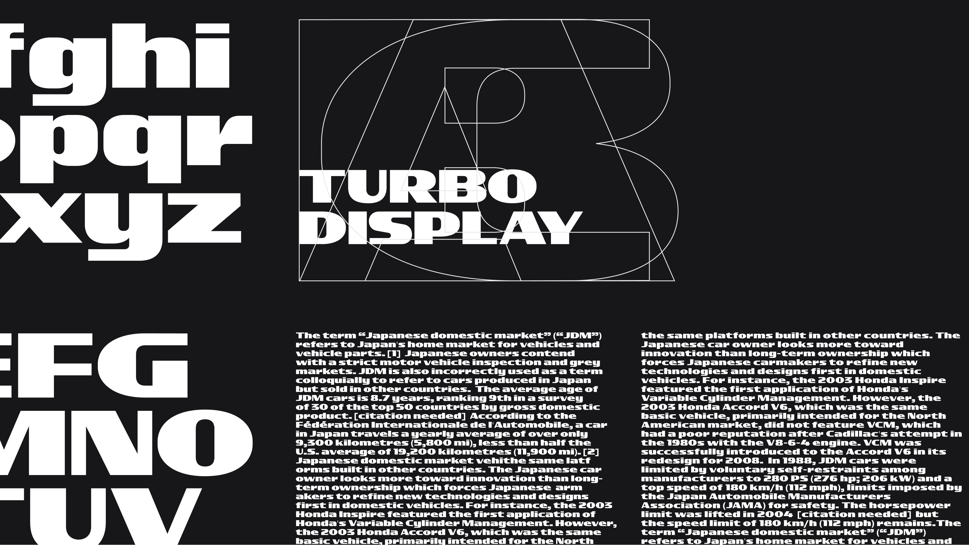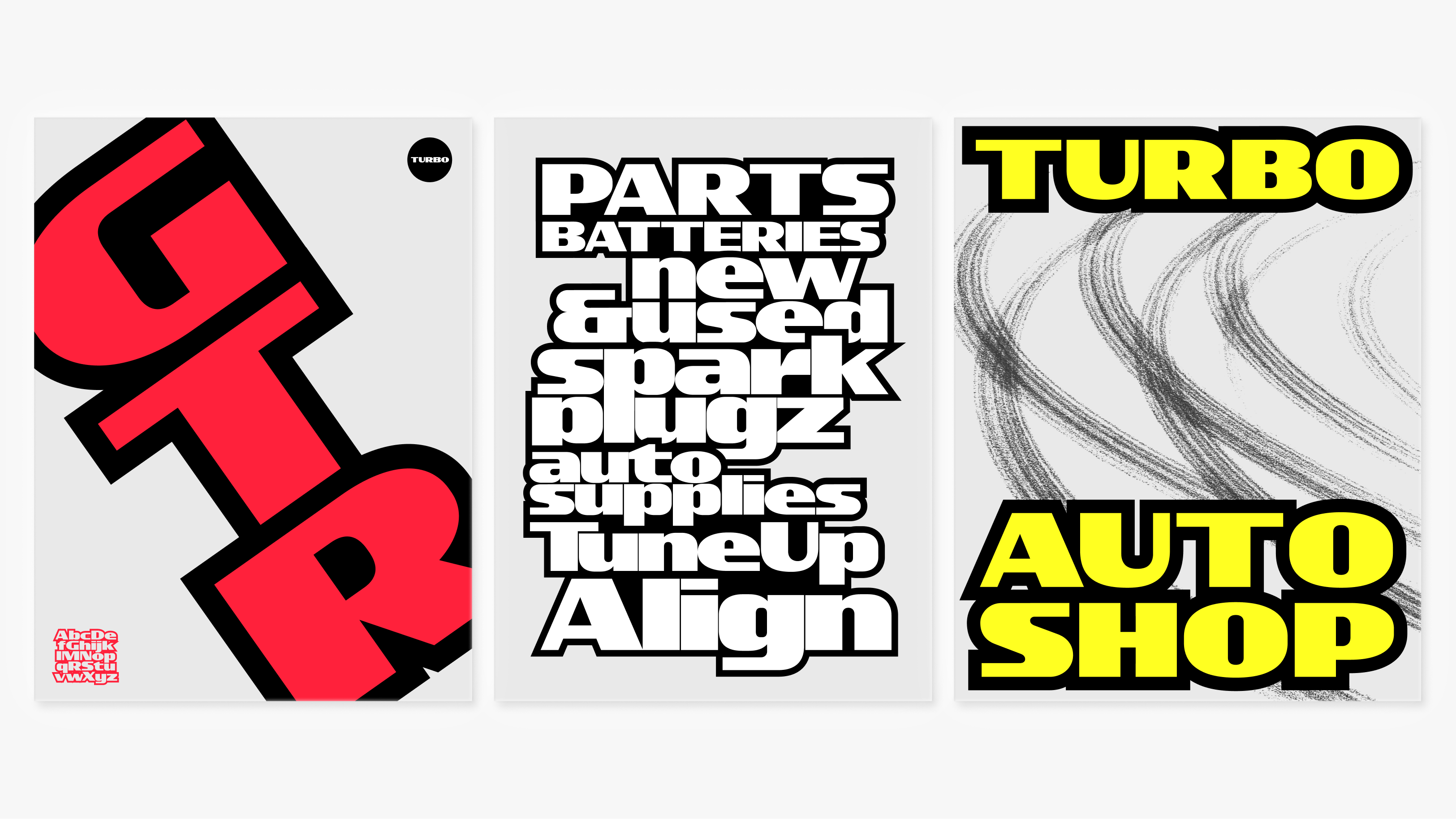 Taking inspiration from hand painted signs found in mechanic and auto shops littered around Los Angeles. Turbo Display makes design decisions based on what a sign painter might be thinking while painting during a hot sunny day. Considering high visibility for all the drivers that pass by shops at break-neck speeds, Turbo was designed heavy and wide. Simple, geometric letter construction and an interrupted translation design with little brush rotation so that sign painters wouldn’t have to sweat too much on an intricate design. The letter “S” really captures the design decisions that carry the rest of the typeface. Simple, fast, and highly visible.
